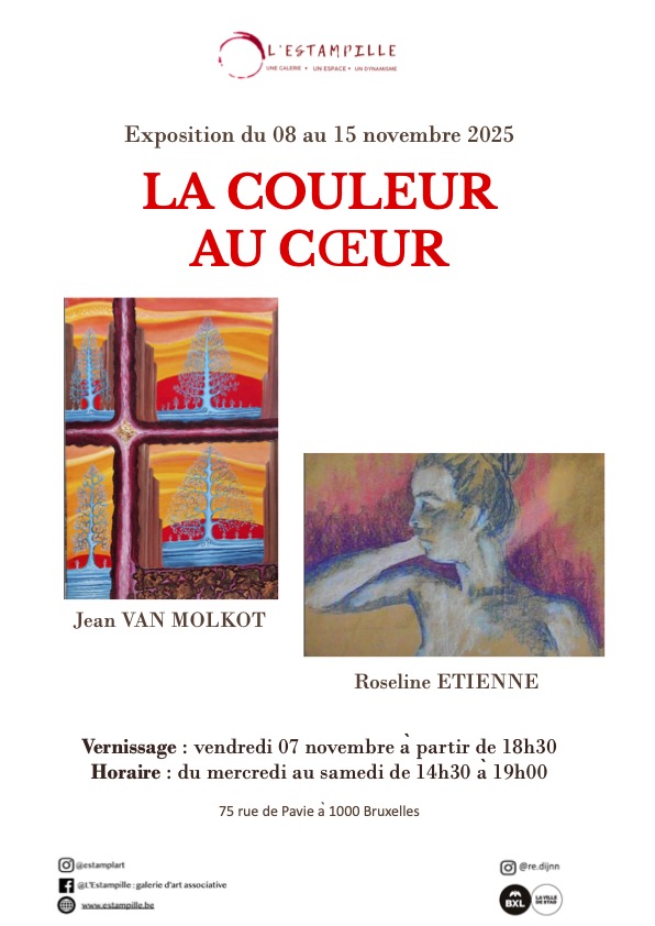 Le vernissage aura lieu le 24 octobre à 18h30à L’Estampille, Rue de Pavie 75, 1000 Bruxelles. L’exposition se tiendra jusqu’au 1er novembre inclus.